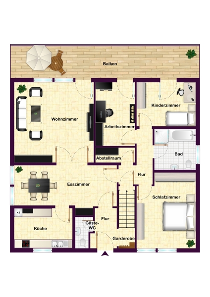 Das Erdgeschoss bietet Ihnen ein großes, lichtdurchflutetes Wohnzimmer mit einem schönen Sonnenbalkon, einen offenen Essbereich, eine geräumige Küche mit Einbauküche, ein Schlafzimmer, ein Kinderzimmer, ein Arbeitszimmer, eine Diele mit begehbarer Garderobe, ein hell gefliestes Tageslichtbad mit Dusche, Badewanne, Waschbecken und Toilette, ein Gäste-WC und einen kleinen Abstellraum.
