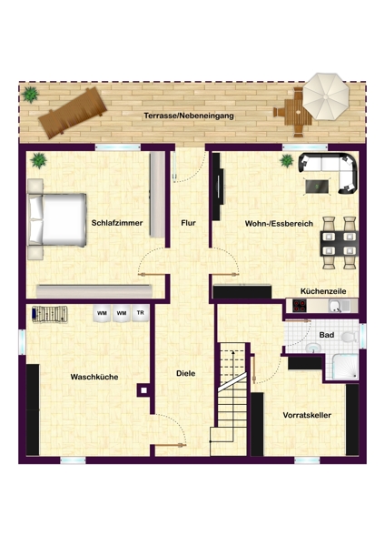 Im Untergeschoss befinden sich ein Wohn-/Essbereich mit Küchenzeile, ein Schlafzimmer, ein Duschbad mit Toilette, eine Waschküche mit Heizungskeller und ein Vorratsraum.
