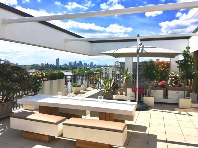 Die nach Süden ausgerichtete Dachterrasse erweitert die stilvolle Wohnlandschaft und bietet einen traumhaften Ausblick auf den Hafen und die Skyline von Frankfurt am Main. Neben dem großzügigen Wohnraum schließt der Master-Bedroom mit Ankleidebereich, einem Badezimmer en Suite und direktem Zugang zur Dachterrasse an. Als besonderes Highlight kann die verspiegelte Sauna im Schlafzimmer bezeichnet werden, die für Behaglichkeit und Entspannung sorgt.
