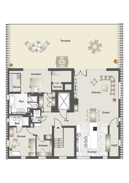 Ein weiteres Schlafzimmer mit eigenem Badezimmer, eine großzügige Garderobe mit Einbauschränken, ein Arbeitszimmer, ein außergewöhnliches Gäste-WC, ein Hauswirtschaftsraum sowie ein Technik- und Abstellraum vervollständigen das Raumangebot, das keine Wünsche offen lässt.