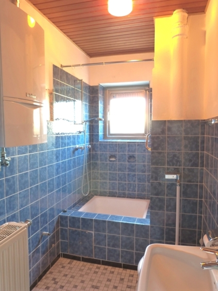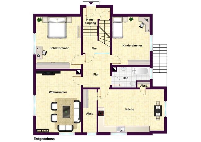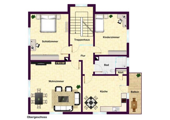 Eingangsflur, Wohnzimmer, Schlafzimmer, Kinderzimmer, Küche, Abstellraum, Tageslichtbad mit Wanne, Waschbecken und Toilette