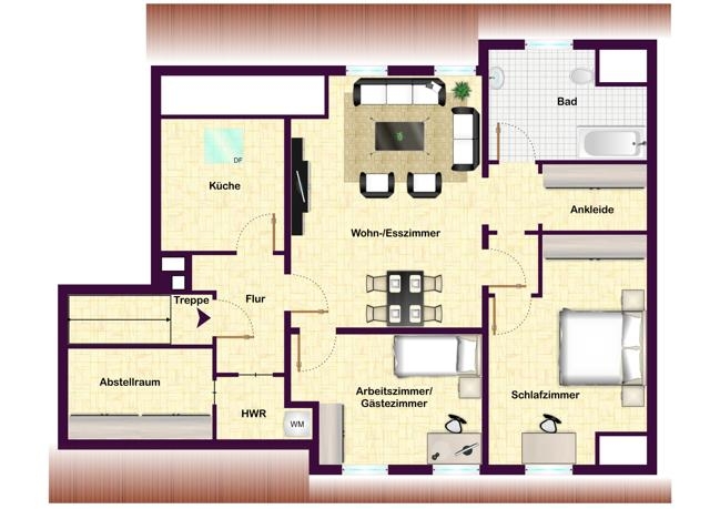 Auf ca. 76 m² Wohnfläche finden Sie hier ein absolut freundliches Wohnambiente mit einem Wohn-/Esszimmer, einem Arbeits-/Gästezimmer, einem Schlafzimmer, einem Tageslichtbad mit Wanne und WC, einer Küche sowie einem einladenden Eingangsbereich. Zur Wohnung gehören ein Dachboden, der sich hervorragend als Abstellfläche eignet, ein kleiner Raum mit einem Anschluss für Ihre Waschmaschine sowie ein separater Kellerraum.