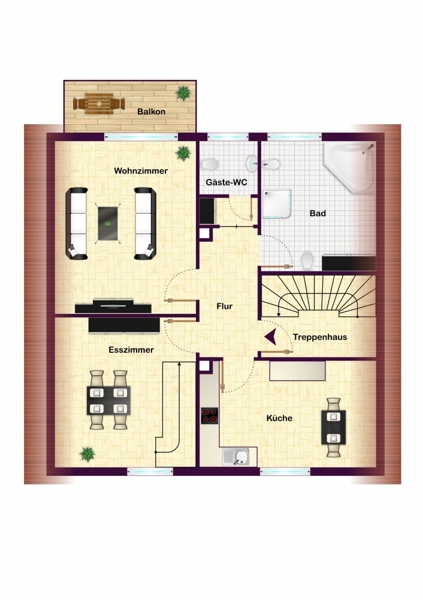 In der unteren Etage befinden sich ein großzügiger Flurbereich, das lichtdurchflutete Wohnzimmer mit direktem Zugang zum Balkon, das Esszimmer, die Küche, ausgestattet mit einer modernen Einbauküche, ein großes, schickes Tageslichtbad mit Eckbadewanne und Dusche und ein separates Gäste-WC sowie ein praktischer Abstellbereich.