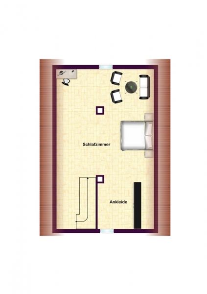 Über eine Holztreppe gelangt man in das Dachgeschoß. Dort befindet sich das gemütliche Schlafzimmer mit Ankleidebereich.