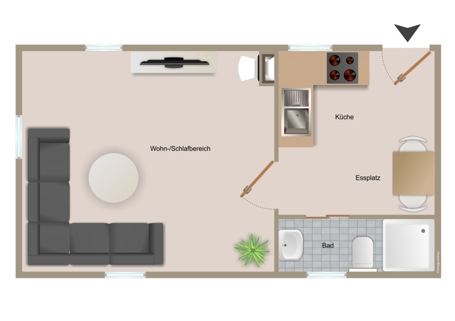 - ein Wohn- und Schlafraum (Deckenhöhe tlw. 1,95 m)