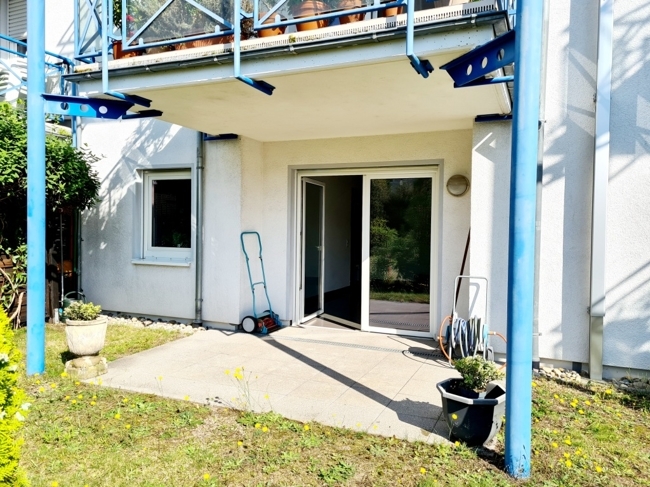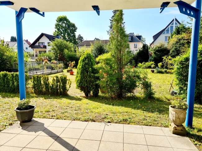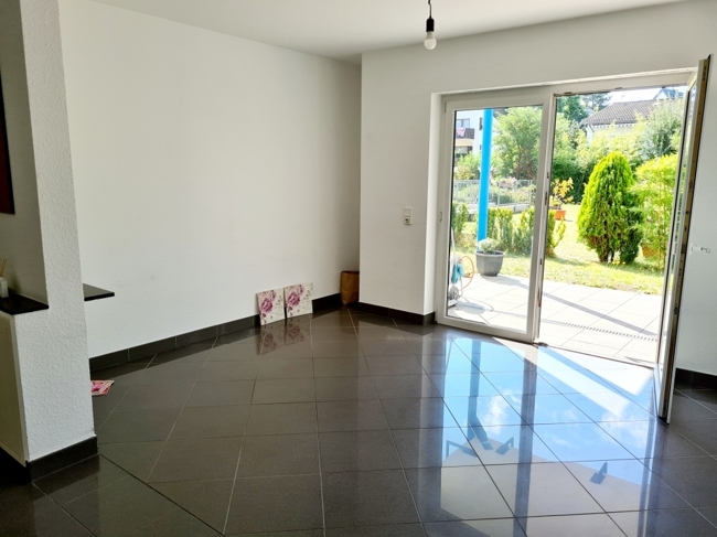 einem Bad mit Wanne, Dusche, Waschbecken und Toilette sowie einem Eingangsflur. Von Ihrer Terrasse aus blicken Sie in den Garten. Bei einem Glas Wein können Sie hier den Tag gemütlich ausklingen lassen.