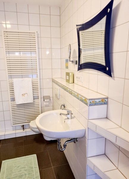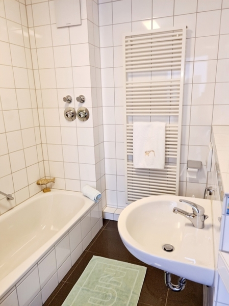 - Modernes Bad mit Wanne, Dusche, Waschbecken und Toilette