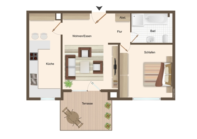 Auf ca. 57 m² Wohnfläche finden Sie hier ein absolut freundliches Wohn-Ambiente mit einem gemütlichen Wohn-/Esszimmer mit direktem Zugang zur Terrasse, einem Schlafzimmer, einer Küche mit Einbauküche,