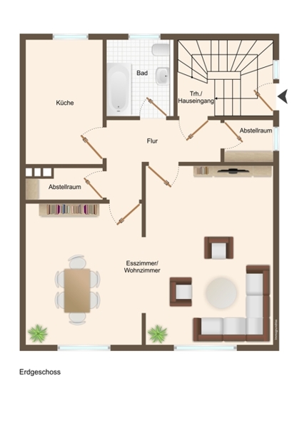 Das Erdgeschoss bietet Ihnen ein großes, lichtdurchflutetes Wohn-/Esszimmer, eine Küche, ein neues, modernes Tageslichtbad mit Badewanne, Waschbecken und Toilette, zwei praktische Abstellkammern sowie einen Eingangsflur. Über eine offene Treppe gelangen Sie in das Obergeschoss.