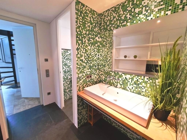 Ein großzügiges Schlafzimmer mit außergewöhnlicher angrenzender Loggia, ein exklusiv gestaltetes Bad mit Badewanne, großer Dusche und heller Fensterfront sowie die z.B. als Büro nutzbare Eingangsdiele, bilden das exquisite Raumangebot der unteren Wohnebene.
