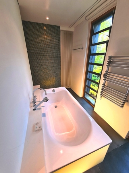 Großes Masterbad mit Wanne, Dusche und Fensterfront