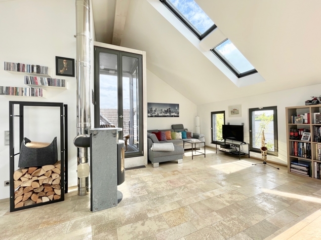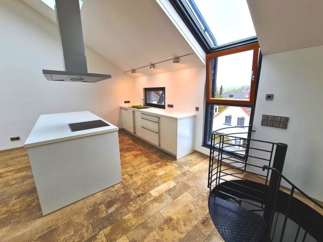 In die Maisonette gelangt man über eine Wendeltreppe im Industrial Chic. Dort befindet sich das große, lichtdurchflutete Wohnzimmer mit Essbereich und offener Küche. Eine moderne Einbauküche lädt zum Kochen ein. Ein Kaminofen sorgt für gemütliche Wärme. Auf der von hier aus begehbaren Loggia, kann man sich bei einem Buch gut entspannen. Ein Duschbad mit WC und praktischem Abstellbereich darf auf dieser Ebene natürlich nicht fehlen.