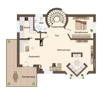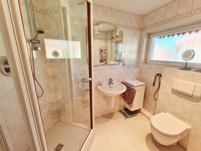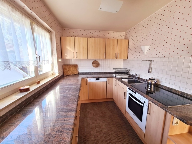 Im Obergeschoss erwartet Sie ein großzügiges, lichtdurchflutetes Wohn-/Esszimmer mit Kachelofen. Von hier aus haben Sie Zugang zur großen Sonnenterrasse mit Blick in den Vorgarten. Ein Schlafzimmer, eine Küche, ausgestattet mit einer Einbauküche, ein Duschbad mit Waschbecken und Toilette sowie ein praktischer, kleiner Abstellraum runden das Angebot auf dieser Etage ab.