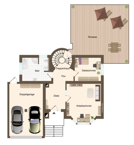 Sie betreten das Haus über den Dielenbereich mit Treppenhaus und Garderobe. Sowohl die großzügige Eingangsdiele als auch die Treppen sind mit Natursteinfliesen in heller Farbgebung ausgelegt. Auf dieser Ebene finden Sie ein Arbeitszimmer, ein Gästezimmer sowie ein schickes Badezimmer mit Wanne, Dusche, Waschtisch, Toilette und Bidet. Vom Erdgeschoss aus führt eine Seitentür hinaus auf die Terrasse und in den Garten hinter dem Haus.