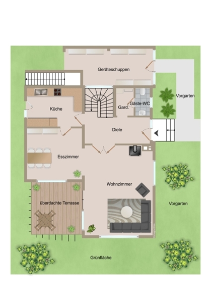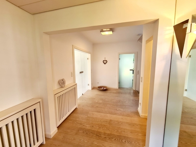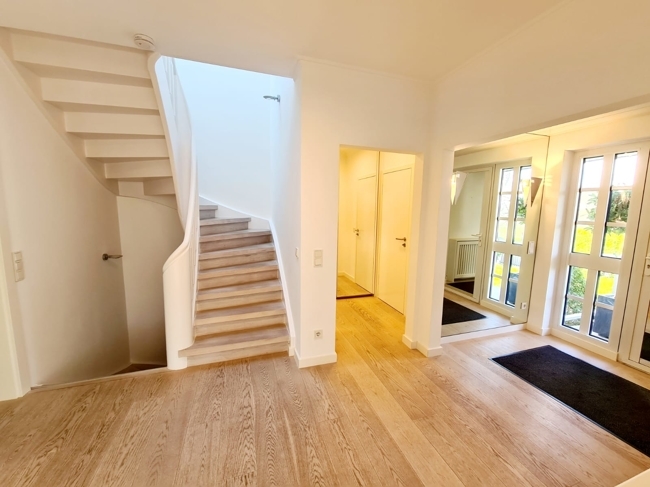 Sie betreten das Haus über den Dielenbereich mit Treppenhaus, einer mit einem maßgefertigtem Einbauschrank ausgestatteten Garderobe und Gäste-WC. Sowohl die großzügige Eingangsdiele als auch die Treppen sind mit Böden in heller Farbgebung ausgestattet.