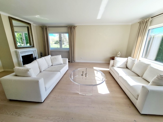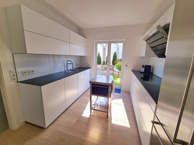 Vom Dielenbereich sowie vom Esszimmer gelangen Sie in die Küche, die mit einer modernen, exklusiven Einbauküche mit hochwertigen Gaggenau- und Miele-Geräten ausgestattet ist. Von hier aus haben Sie ebenfalls einen Zugang in den Garten.