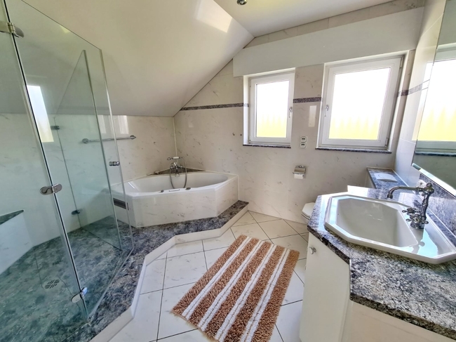 Über eine massive Holztreppe (amerikanische Esche) gelangen Sie in das Dachgeschoss. Hier erwarten Sie ein Schlafzimmer, ein Kinderzimmer, ein Arbeits-/Gästezimmer, ein Duschbad mit Toilette sowie ein weiteres Tageslichtbad mit Eckbadewanne und Whirlpoolfunktion, Dusche, Waschtisch und Toilette. Vom Kinderzimmer haben Sie einen direkten Zugang zum Balkon mit Blick ins Grüne.