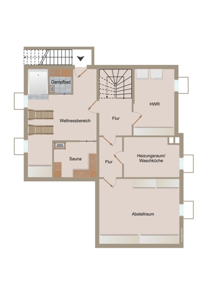 Das Haus ist voll unterkellert mit diversen Nutzungsmöglichkeiten. Das Kellergeschoss mit direktem Gartenzugang verfügt neben dem kombinierten Heizungs- und Waschraum über einen Hauswirtschaftsraum, einen großen Abstellraum sowie über einen großzügigen Wellness-Bereich mit Sauna, Dampfbad und Dusche.