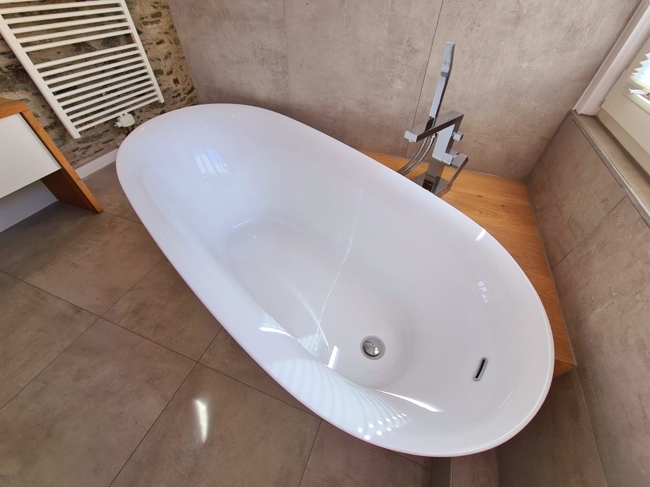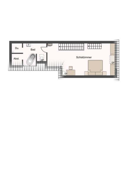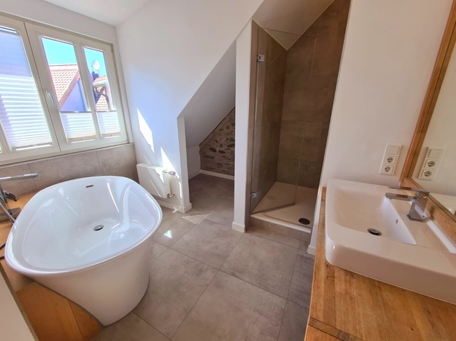 Über eine weitere Treppe erreichen Sie das Dachgeschoss. Hier befinden sich ein gemütliches Schlafzimmer mit einem kleinen, ausklappbaren Balkon sowie ein schickes Badezimmer mit einer freistehenden Badewanne, einer großen Dusche, einem Waschtisch und einer Toilette.