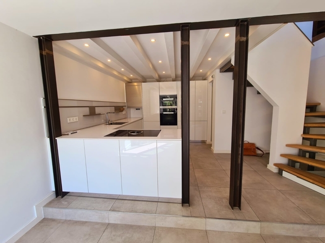 Über eine massive Treppe aus Stahl und Holz kombiniert gelangen Sie in das Obergeschoss. Hier befinden sich das Arbeitszimmer und das Wohnzimmer.