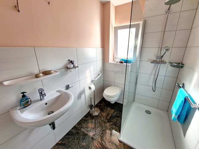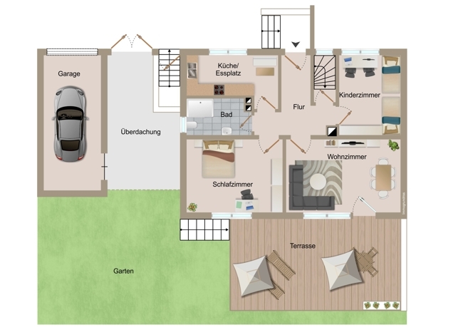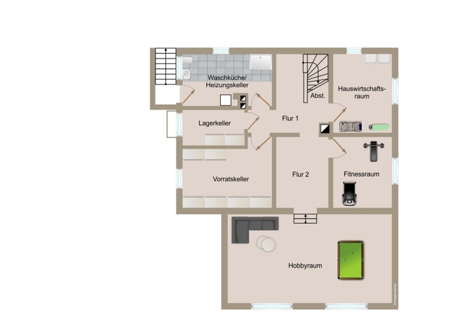 Das Erdgeschoss bietet Ihnen ein lichtdurchflutetes Wohnzimmer mit Zugang zur großen Sonnenterrasse, ein Schlafzimmer, ein Kinderzimmer, eine Küche mit Essplatz, ein modernes, barrierefreies Duschbad mit Waschbecken und WC sowie eine Diele. Von der Eingangsdiele gelangen Sie über eine Treppe in das Kellergeschoss. Hier erwarten Sie ein Hauswirtschaftsraum, ein Fitnessraum und ein Hobbyraum, wobei alle drei Räume einen wohnwertähnlichen Charakter aufweisen und als Arbeits- oder Gästezimmer genutzt werden könnten. Zudem befinden sich im Kellergeschoss ein Vorratskeller, ein Lagerkeller sowie ein Heizungskeller mit Waschküche, Dusche, Waschbecken und WC. Von hier aus führt eine Treppe zum Aussenbereich.