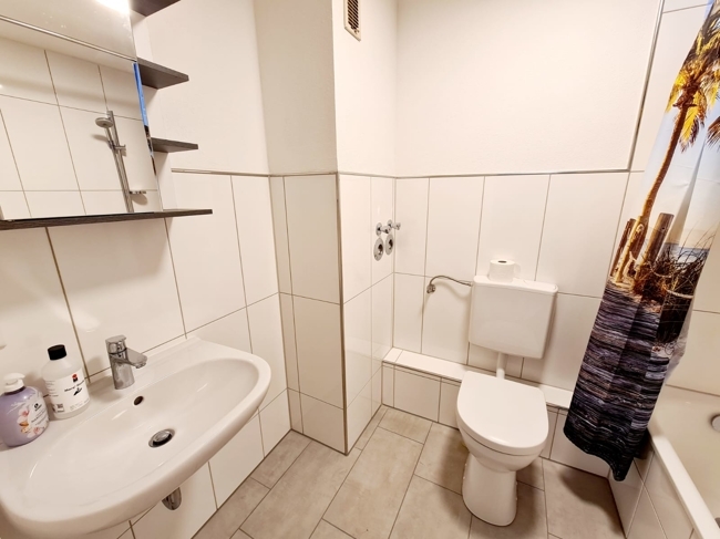 - Modernes Bad mit Badewanne, Waschbecken und Toilette
