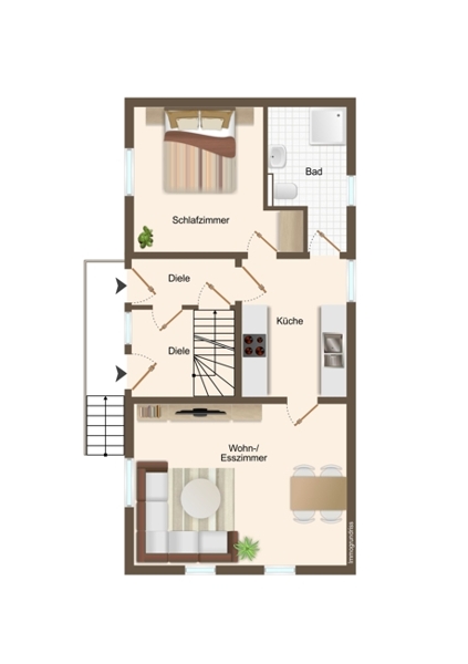 Auf ca. 50 m² Wohnfläche finden Sie hier ein absolut freundliches Wohnambiente mit einem Wohnzimmer, einem Schlafzimmer, einer Küche mit Einbauküche und Elektrogeräten, einem modernen Tageslichtbad mit Dusche, Waschbecken, Toilette und einem Anschluss für Ihre Waschmaschine sowie einem Eingangsbereich.