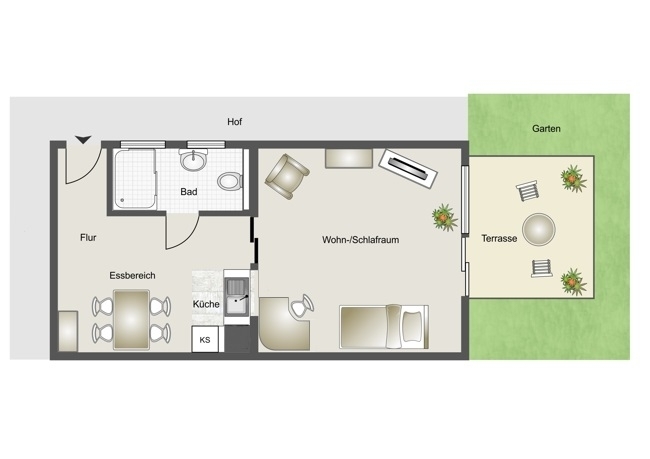 Auf ca. 37 m² Wohnfläche finden Sie hier ein absolut freundliches Wohnambiente mit einem Wohn-/Schlafraum, einer Pantryküche mit Elektrogeräten, einem Essbereich mit Tisch und Stühlen, einem modernen Tageslichtbad mit Dusche, Waschbecken und Toilette sowie einem Eingangsbereich. Mit wunderbarem Blick in den Garten, können Sie auf der Terrasse den Tag bei einem Glas Wein entspannt ausklingen lassen.