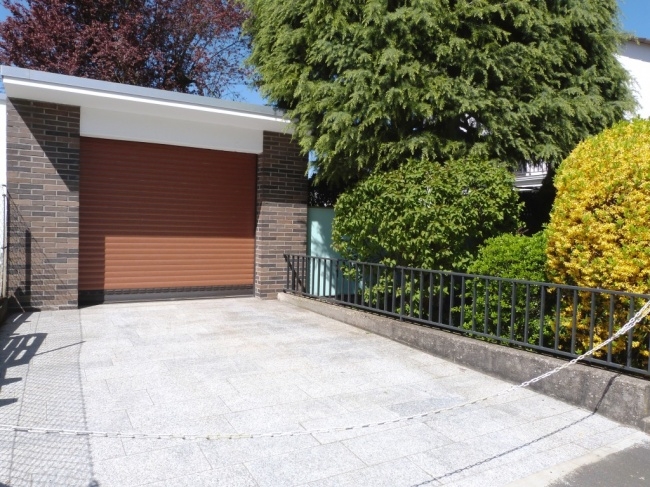 Im seitlichen Teil des Grundstücks sind eine Garage mit Geräteraum sowie ein davorliegender Stellplatz gelegen.