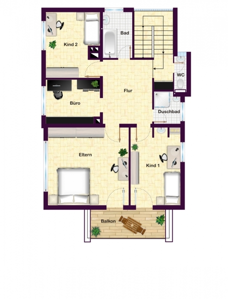 Im Obergeschoss erwarten Sie ein großes, helles Schlafzimmer mit einem nach Südwesten ausgerichteten Balkon, zwei Kinderzimmer, ein Arbeits-/Gästezimmer, ein Tageslichtbad mit Wanne, ein kleines Duschbad, ein separates WC und eine Diele.
