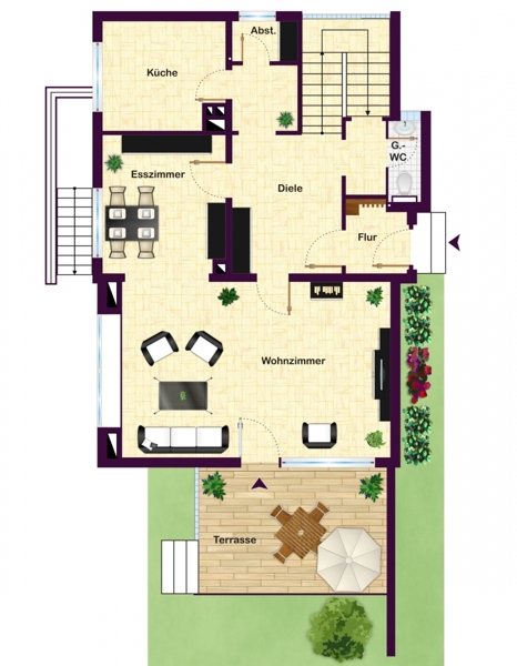 Das Erdgeschoss bietet einen großzügigen Flur- und Dielenbereich mit Einbauschränken, ein lichtdurchflutetes Wohn-/Esszimmer mit vorgelagerter Terrasse, eine Küche mit angrenzendem, kleinen Abstellraum und ein Gäste-WC.