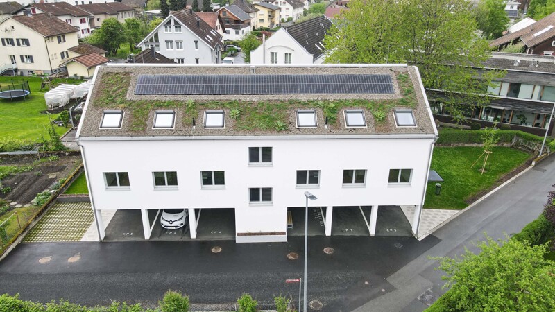 Zu jeder Einheit gehört ein Carport mit dahinterliegendem Schopf inkl. privatem E-Bike-Anschluss. Für das vermehrte Aufkommen von Paketzustellungen ist eine private Paketabstellstation vorgesehen.