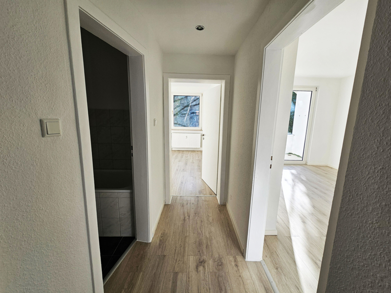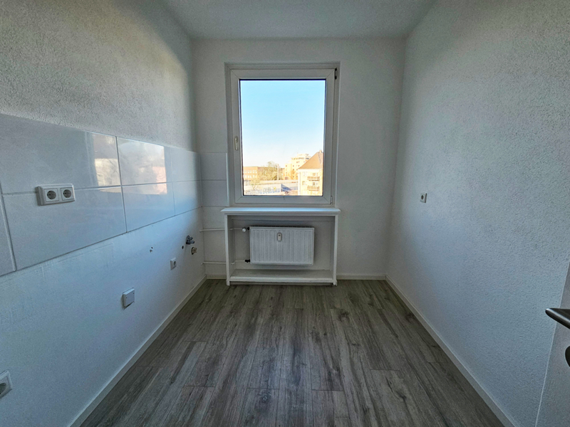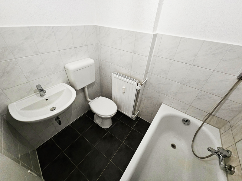 Die Wohnräume sind mit hellem Laminatboden ausgestattet, der der Wohnung eine moderne und zugleich helle Atmosphäre verleiht. Die kompakte Küche ist funktional gestaltet und mit einem pflegeleichten Fliesenspiegel versehen. Das Badezimmer verfügt über eine Badewanne und bietet ausreichend Platz für den täglichen Komfort.