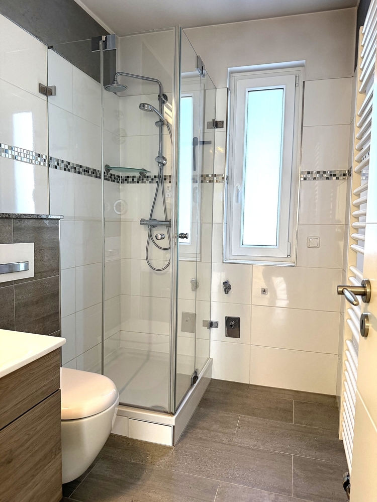 Das modern gestaltete Duschbad mit Fenster ist mit hochwertigen Objekten, Armaturen (Grohe o.ä.) und einer Echtglas Duschabtrennung ausgestattet worden. Eine Kombination von hochwertigen betongrauen und weißen Fliesen geben dem Bad eine edle Note.