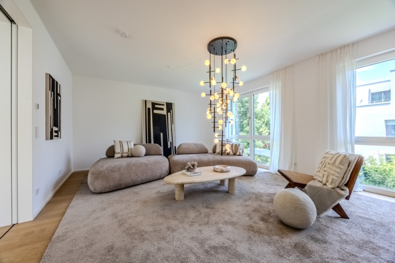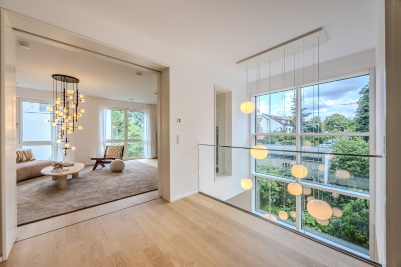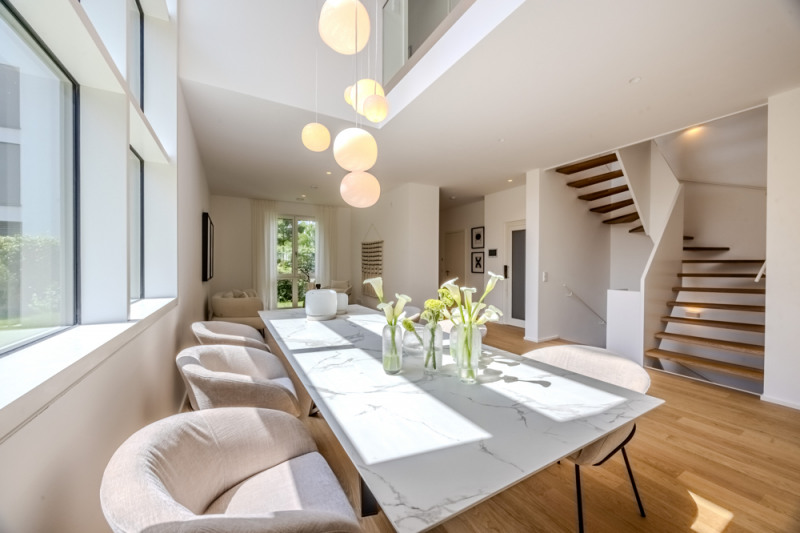 Große Fensterfronten und Terrassen auf Garten- und Dachebene öffnen den Blick in die Parklandschaft und integrieren die Natur in das Wohnerlebnis. Dieses naturnahe Lebensgefühl in zentraler Lage ist eine echte Rarität. Hochwertige Materialien und eine klare, reduzierte Formsprache unterstreichen den Anspruch an Architektur und Design und prägen den stilvollen Gesamteindruck.