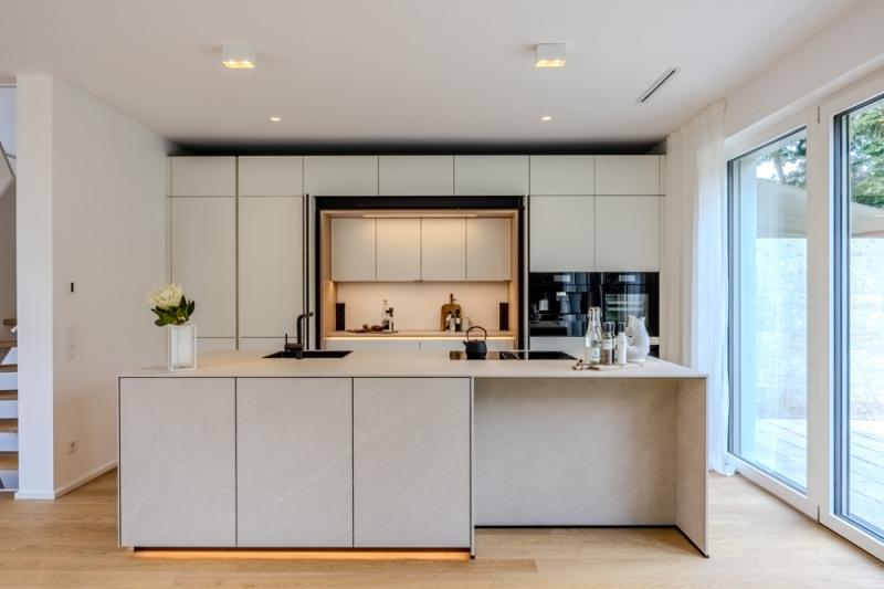 Das hier angebotene Haus ist schon errichtet und befindet sich derzeit in der finalen Ausbauphase. Die gezeigten Bilder zeigen eine bereits fertiggestellte und verkaufte Referenzvilla innerhalb des Ensembles. Das angebotene Haus wird in gleicher architektonischer Qualität voraussichtlich Ende Juli 2026 fertiggestellt – selbstverständlich mit der Möglichkeit, einzelne Details noch nach individuellen Vorstellungen zu gestalten bis etwa Anfang des kommenden Jahres.