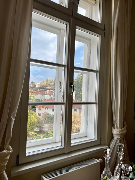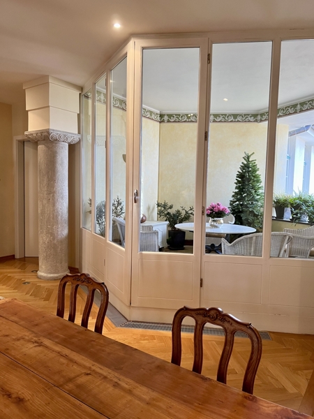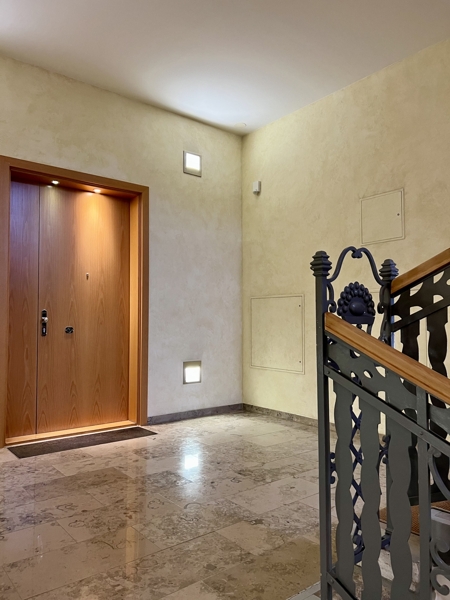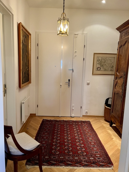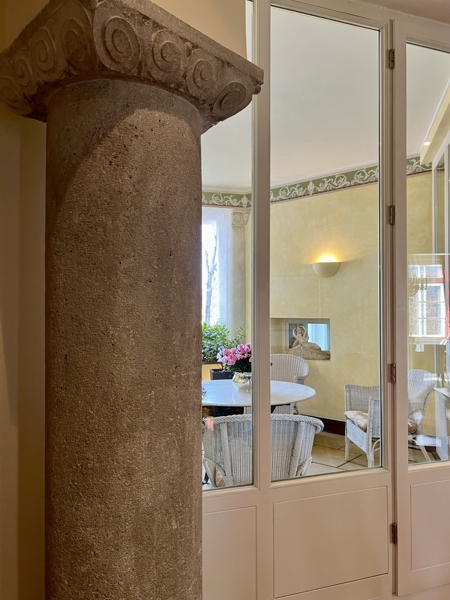 Bei den Sanierungsarbeiten haben die Eigentümer darauf bestanden, die authentischen Elemente des Bauwerkes in die Wohnung einfließen zu lassen. Aus diesem Grund befindet sich im Entree eine Säule, welche im gesamten Gebäude wiederzufinden sind.