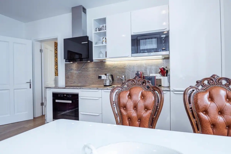 Das Wohnzimmer ist der Mittelpunkt der Wohnung und verfügt über eine offene Küche, einen stilvollen Esstisch und eine gemütliche Couch.