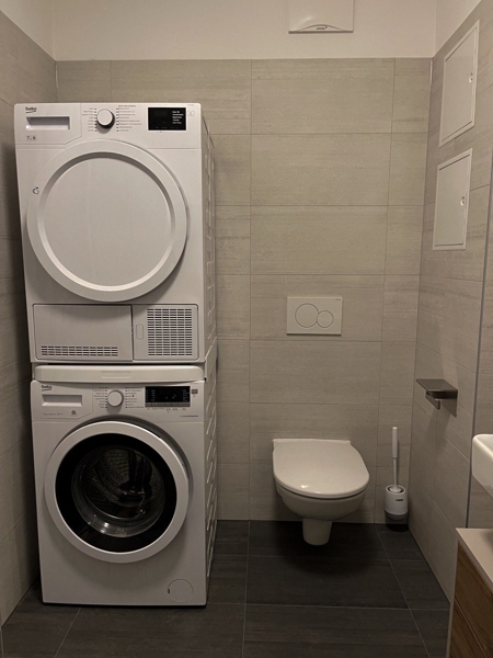 Im oberen Stockwerk finden Sie drei geräumige Schlafzimmer und zwei Badezimmer. Ein Badezimmer verfügt über eine Dusche und ein Waschbecken, während im zweiten Badezimmer eine Waschmaschine und ein Trockner für Ihre Bequemlichkeit zur Verfügung stehen. Zu dem zweiten Badezimmer hat das Masterschlafzimmer Zugang. Des Weiteren gehört zu diesem ein Ankleideraum mit integrierten Schränken. Dieses praktische Feature macht die Wohnung ideal für Familien oder größere Haushalte.