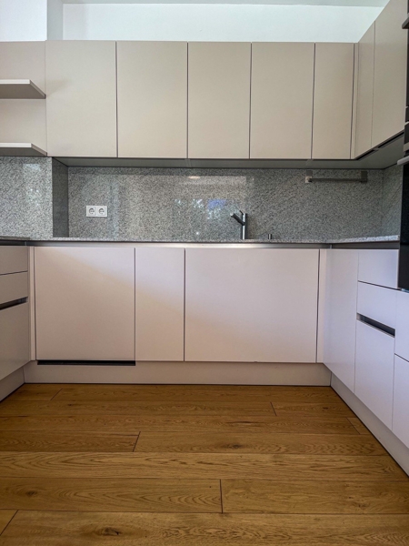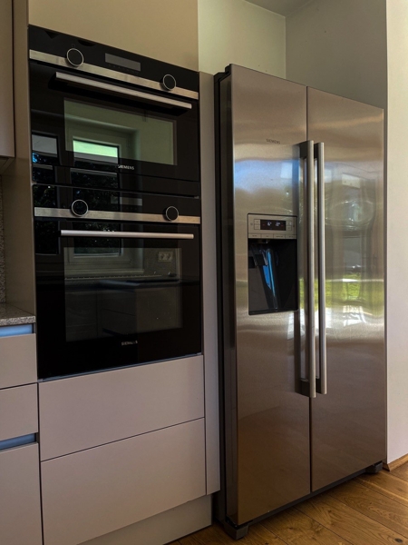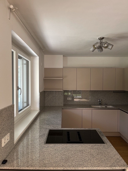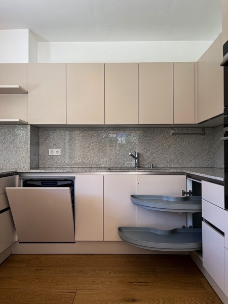 Der Wohnbereich zeichnet sich durch ein offenes Raumkonzept aus, das mit einer modernen Küche von EWE mit elfenbeinfarbenen Möbeln ausgestattet ist. Die Küche ist mit hochwertigen Siemensgeräten und einer Granitarbeitsplatte ausgestattet, die das Kochen und Zubereiten von Mahlzeiten zu einem Vergnügen machen. Die offene Gestaltung fördert das gesellige Beisammensein mit Familie und Freunden.